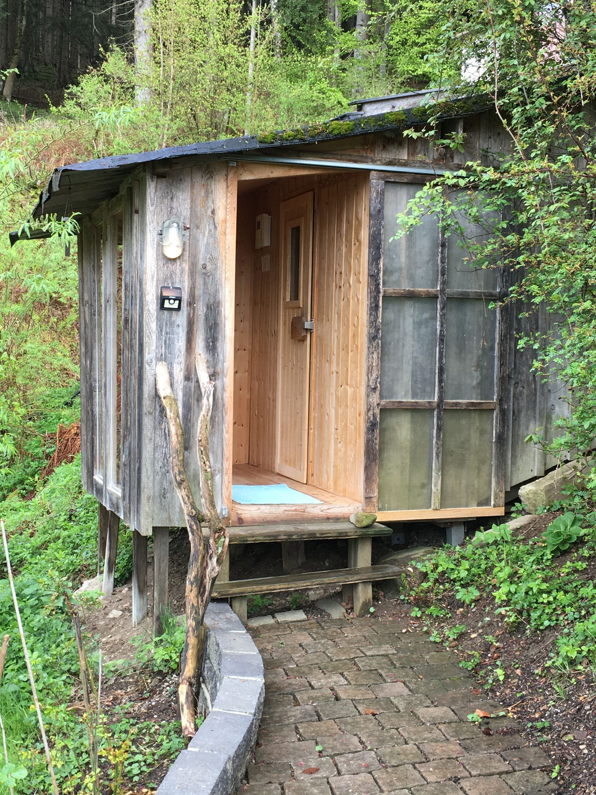 Eine Sauna steht gleich nebenan im Freien, mit Tauchbecken zur Abkühlung.