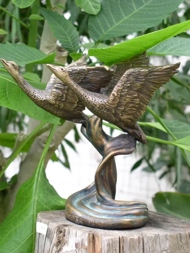 From the Watersmall sculptureTwo geese fly together, standing together, as geese do in life, traveling for ever together with each other.High: 10inch, 25cm hoch